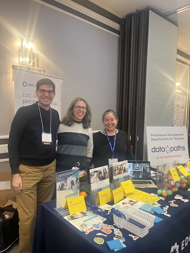 Data Paths team members spotlighted EDC’s Data Paths project at an exhibit table at the ATMIM [Association of Teachers of Mathematics in Massachusetts] 2025 Spring Conference—Breaking Boundaries: Beyond the Limits of Mathematics—at the College of the Holy Cross in Worcester, MA. Our team was excited to meet with over 125 teachers and share our upcoming professional learning opportunities.